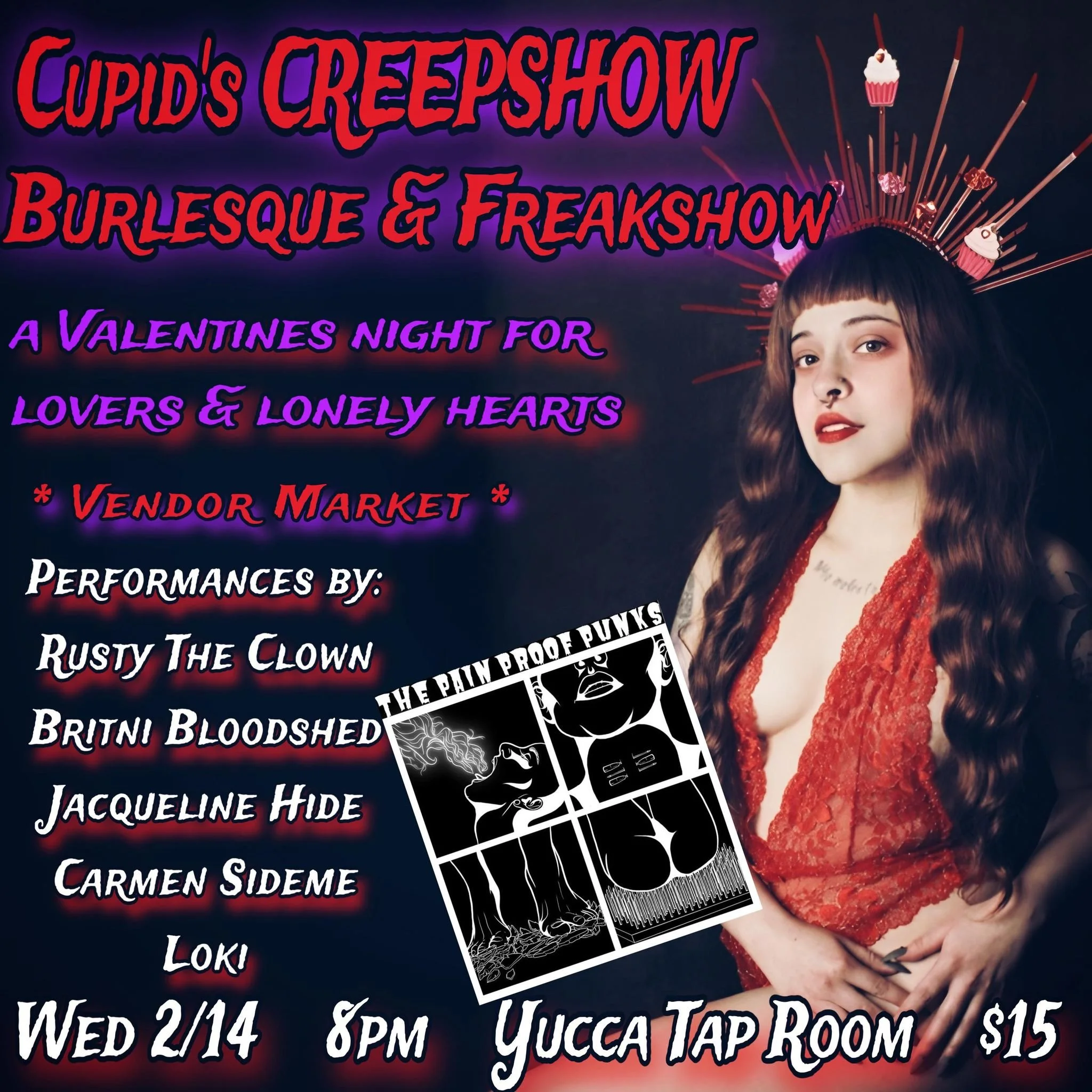 The Pain Proof Punks are back again to excite and fright with Sideshow, Burlesque, and more!! Are you looking for the perfect Valentines date for your unique taste!? Something fun and daring?Or an alluring and exciting event for yourself? We have the perfect mix of the beautiful and bizarre!! Together we will take you through a journey of lust, desire, and delight with classics Sideshow skills! Our artists will display skills such as Burlesque, Glass Walking, Staple Gun, Bed Of Nails, and more!